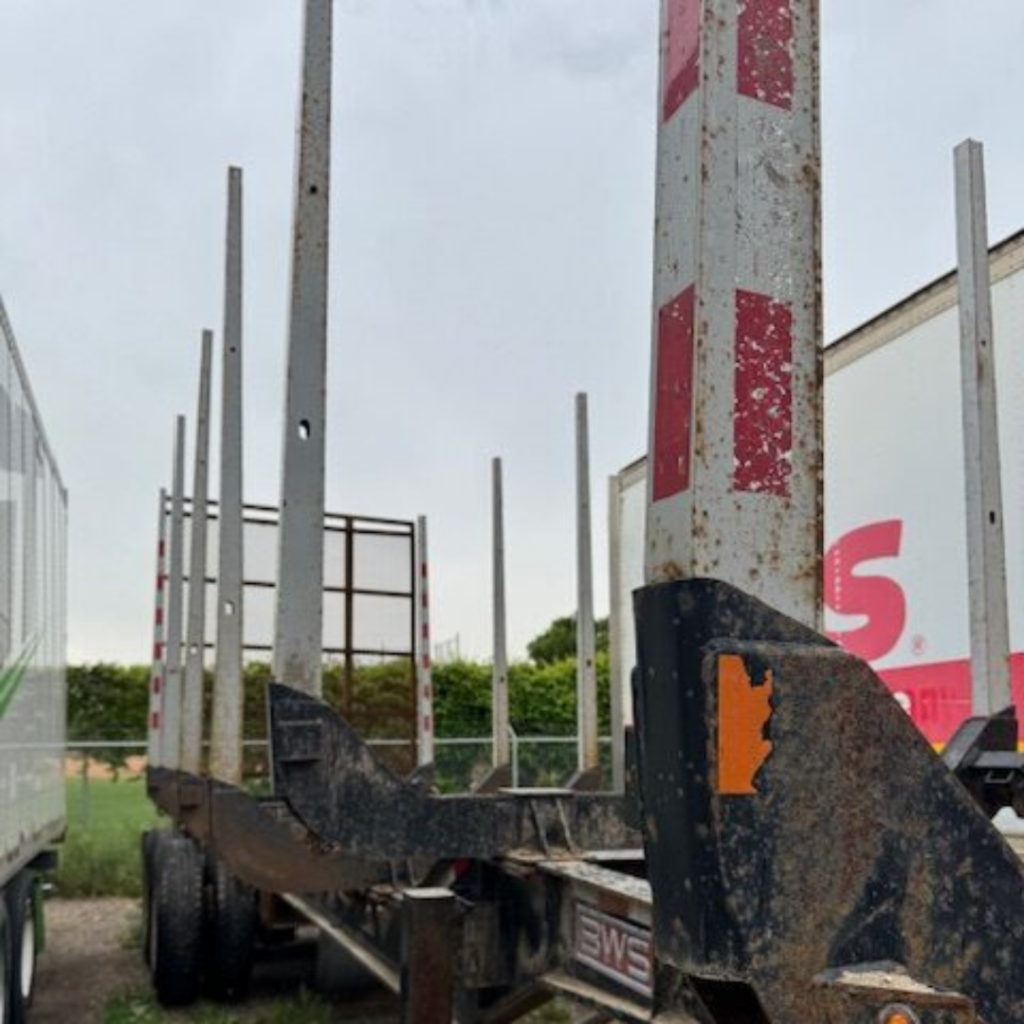 Heavy-spec BWS Forestry Lead trailer. This unit is job-site ready with a valid SGI safety inspection. Features a rugged construction suitable for harsh forestry environments. Configuration: Tridem Axle Lead with Rear Fifth Wheel. Safety Status: Valid SGI Safety (Expires Feb 2025). Condition: Tires show good tread depth. Frame and bunks are structurally sound.